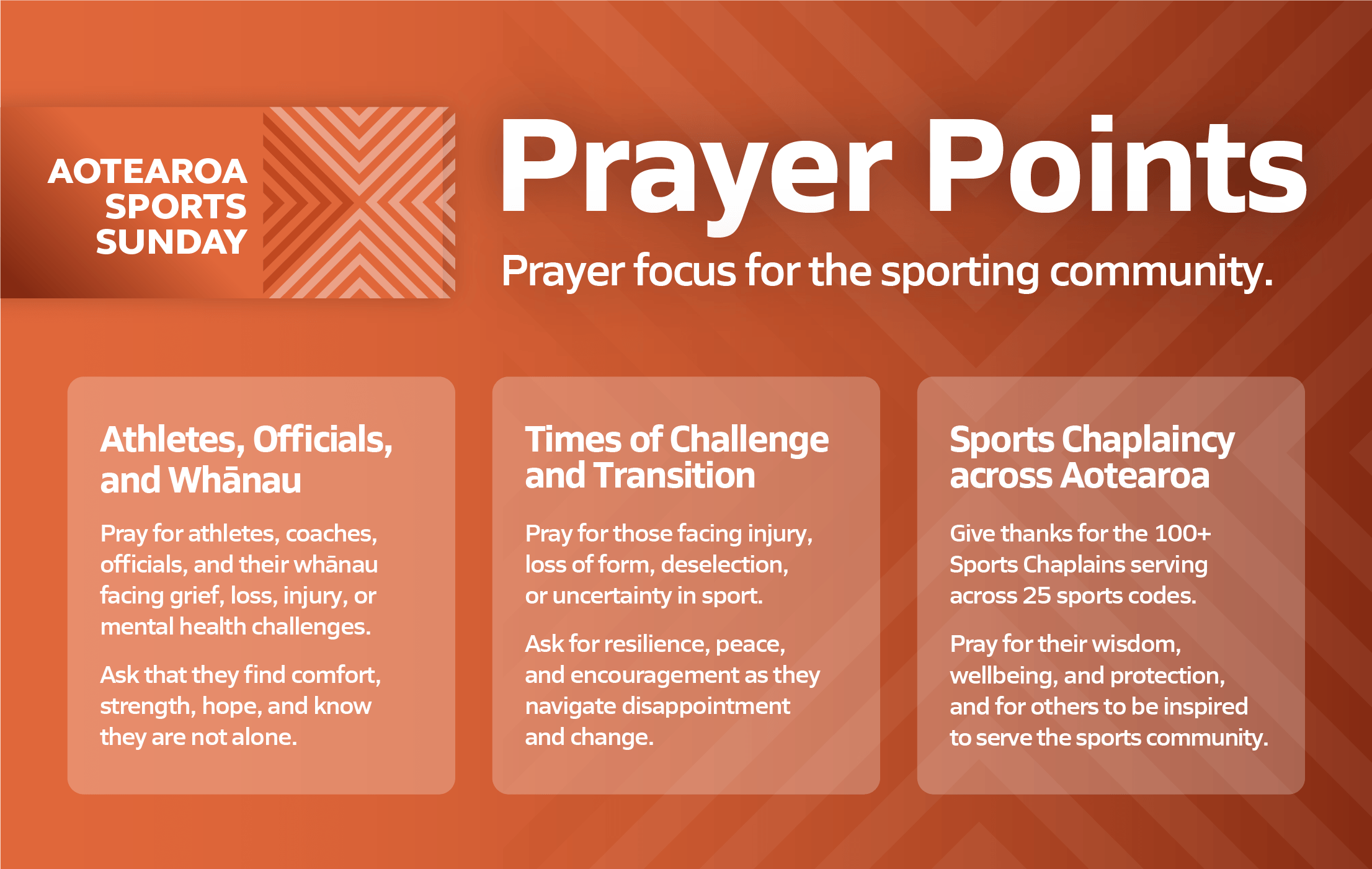 On May 17th 2026, Sports Chaplaincy New Zealand is collaborating with Global Sports Sunday - a call for churches to express God’s love for people in sport through prayer/karakia.